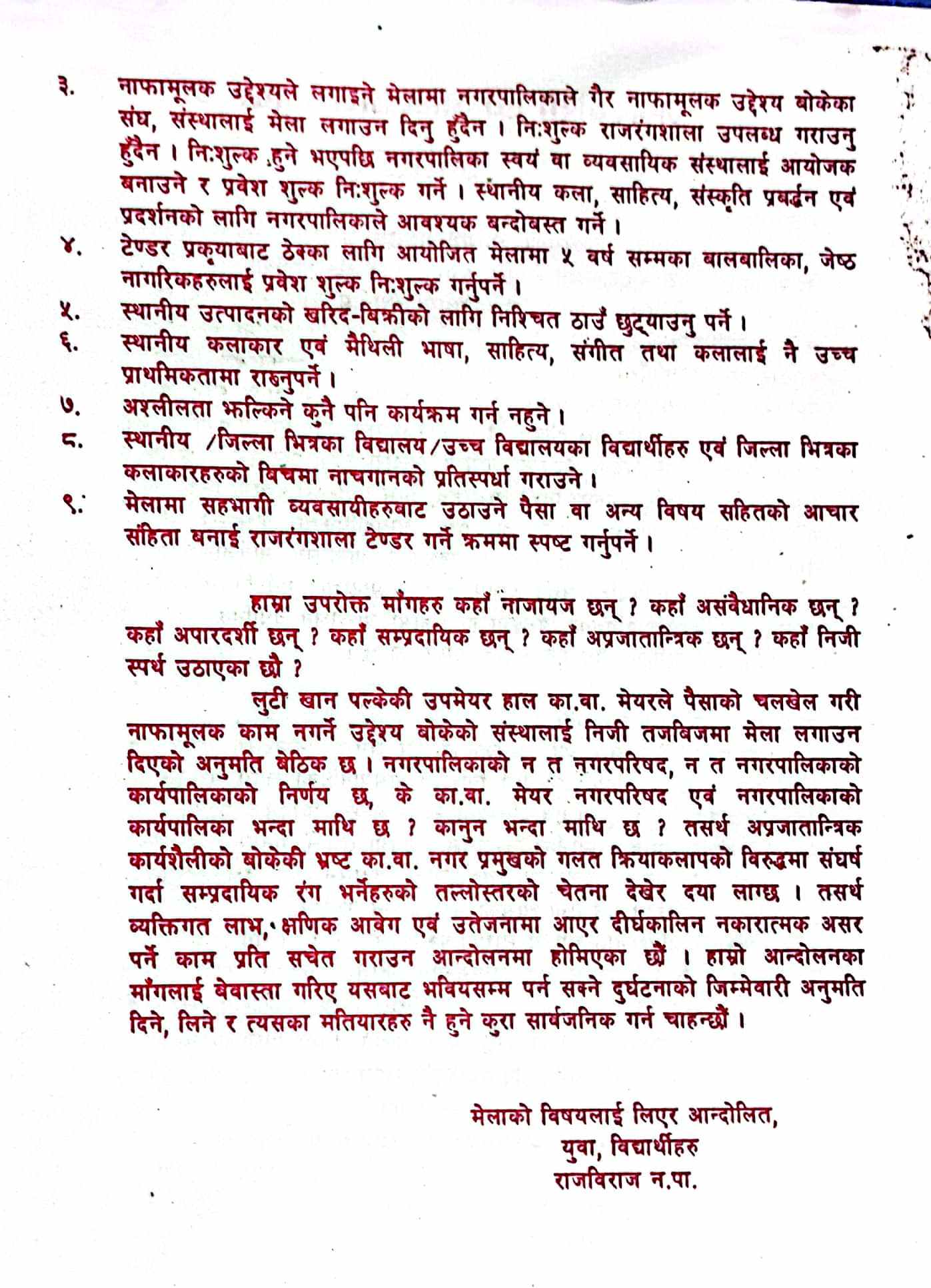 राजविराज । राजविराज नगरपालिकाका कार्यवाहक नगरप्रमुख इसरत परविनविरूद्ध आन्दोलनरत रहेका संयुक्त विद्यार्थी संगठनले शनिवार अपिल जारी गरेको छ। आन्दोलित युवाहरुले नौ बुँदे माग सार्वजनिक गरेका छन् ।